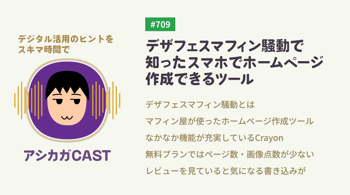 デザフェスで騒動になったマフィン屋さんが「お詫びとご案内」を公開するのにCrayonというホームページ作成ツールを使っていました。スマホで簡単に使えるというCrayonの機能などについて調べたことを話しました。