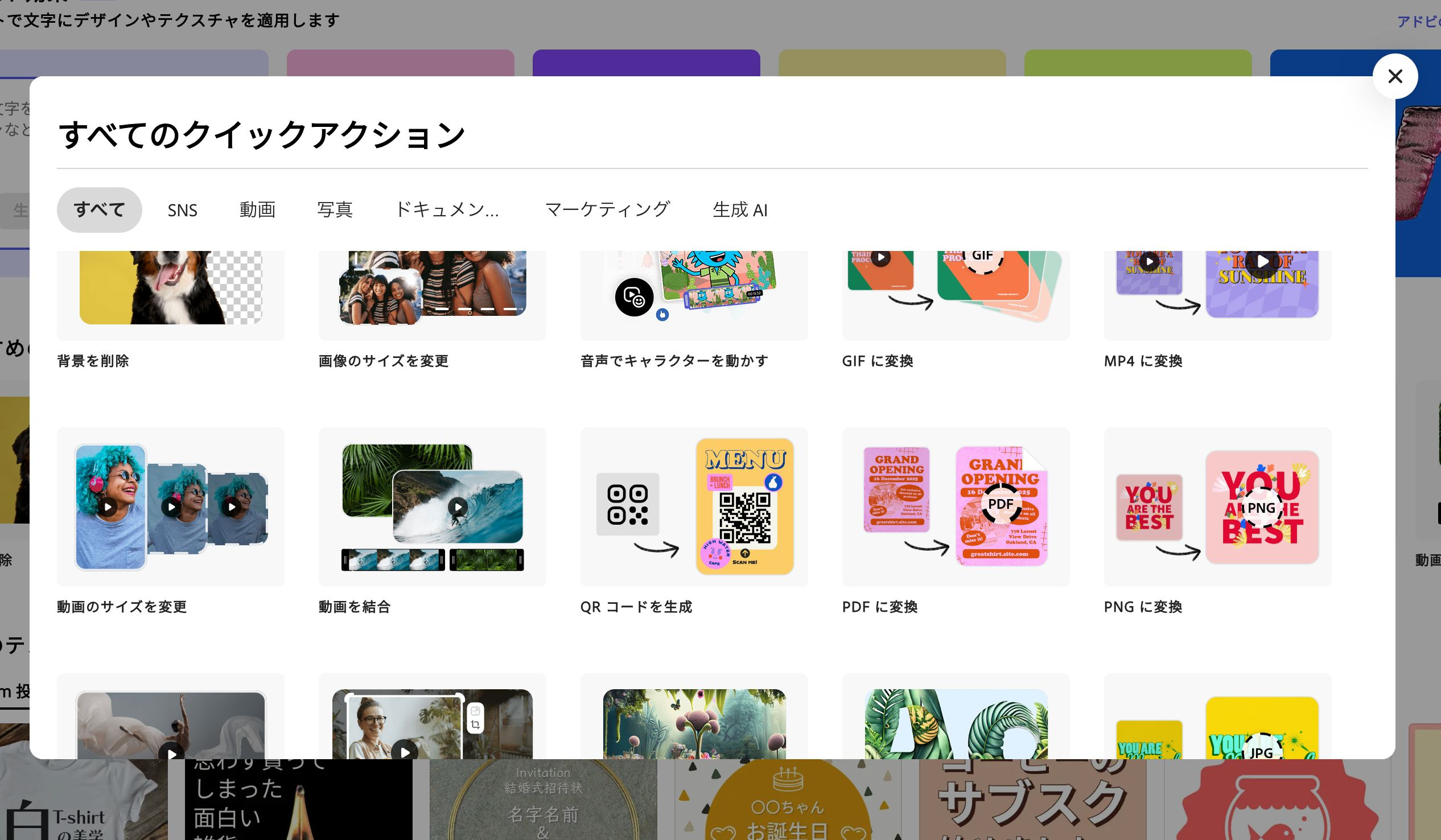 画像を作った後でキャンバスサイズを変える機能は、各種SNSに同じ画像や動画を使い回すときに便利です。この機能は、Canvaでは有料プランのみ使えるので試せていないのですが、Adobe Expressでは無料プランでも使えるようです。