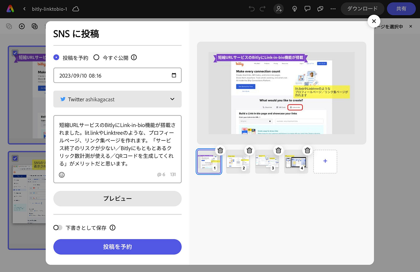 今回初めて実際にSNS予約投稿を使ってみました。ページ分けして作った画像を全4ページ選択して、Twitter(X)に投稿する予約をします。本文を入力して投稿日時を設定して、問題なく投稿されました。