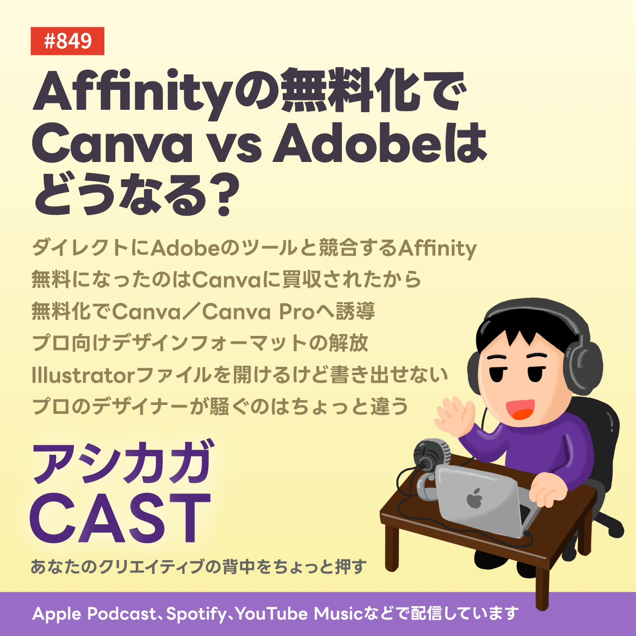 デザイン界隈で話題のAffinityの無料化について、どういう戦略で無料になったのか、ライバルとされているAdobeはどうなるのかについて話しました。なお、プロのデザイナーが大騒ぎすることはないしAdobeはまだ大丈夫というのがわたしの意見です。