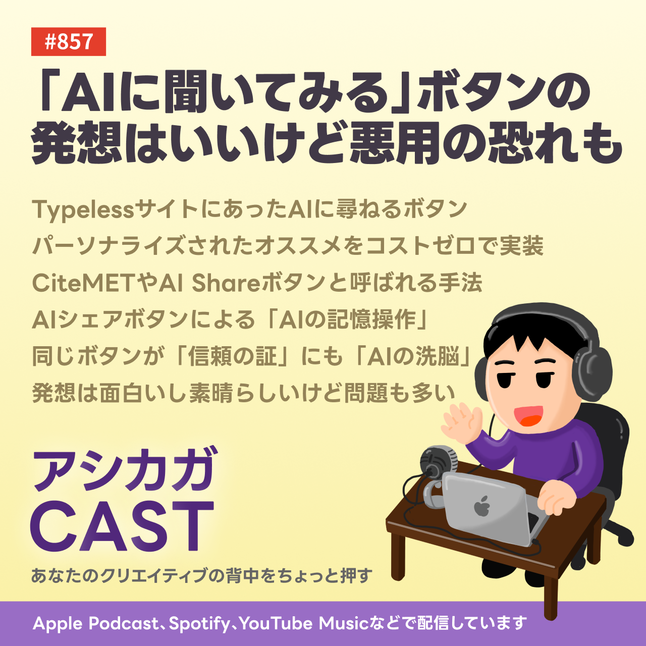 この番組アシカガCASTは「あなたのクリエイティブの背中をちょっと押す」をテーマに、デジタル活用のヒントをわかりやすくお届けすることを目指しています。