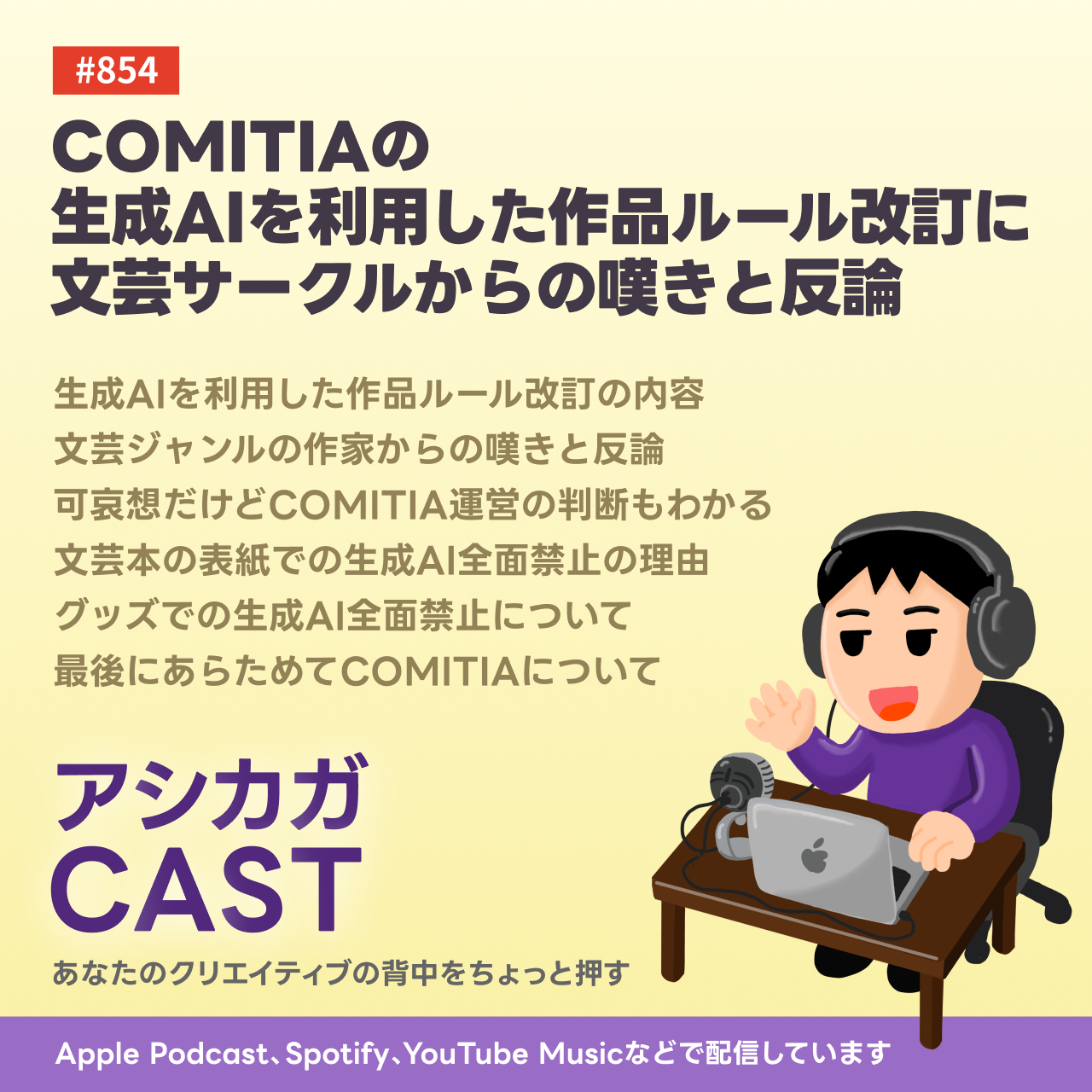 COMITIAで「AI生成物を表紙や挿絵に用いた絵本や文芸」がNGと明示されたことへの文芸ジャンルの作家からの反応や、その判断に至った理由の推測を話しました。COMITIA(コミティア)は、オリジナル作品オンリーの自主制作漫画誌展示即売会です。