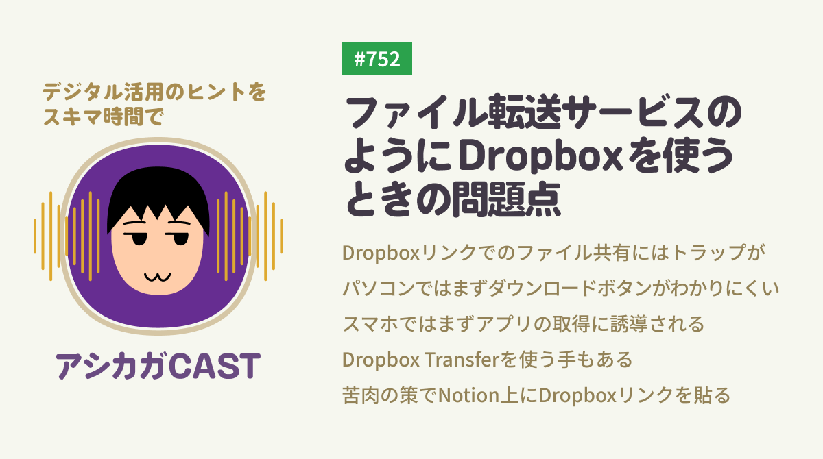 Dropboxをファイル転送サービスのように使う場合に、相手に表示される画面ではすんなりダウンロードさせてくれないので気をつけようという話です。とにかくユーザー登録やアプリのインストールへの誘導が目立っています。