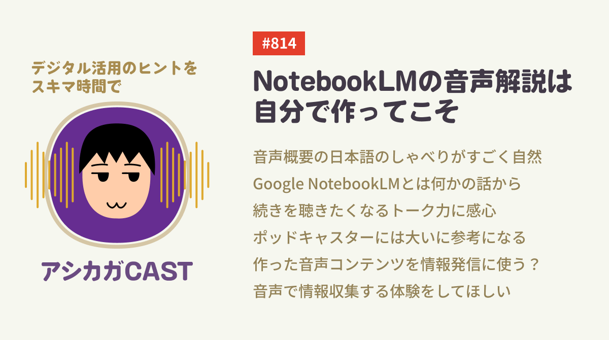 Google NotebookLMの音声概要のトーク力には感心しました。音声コンテンツとして情報発信に使うより、ひとりひとりが自分で使って耳での情報収集を体験するのをおすすめしたいという話をしています。